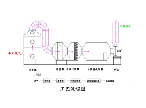 噴淋塔的工作原理:廢氣首先經(jīng)過噴淋塔酸堿中和吸收洗滌和除霧處理后,部份氣體已溶于水或已被吸收液中和吸收,未完全處理的氣體再進(jìn)入活性炭吸附裝置繼續(xù)進(jìn)行凈化。經(jīng)過活性炭的吸附,活性炭將有機(jī)廢氣中的苯類、醇類、烴類、烷類吸附在它的活性表面上,達(dá)到凈化的目的,凈化后的氣體高空排放。